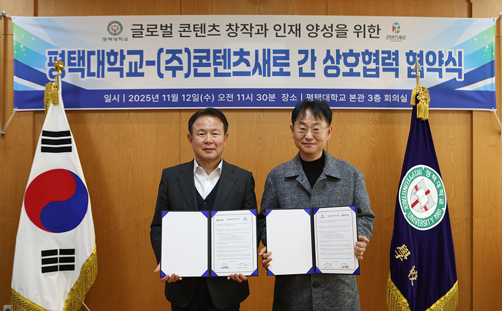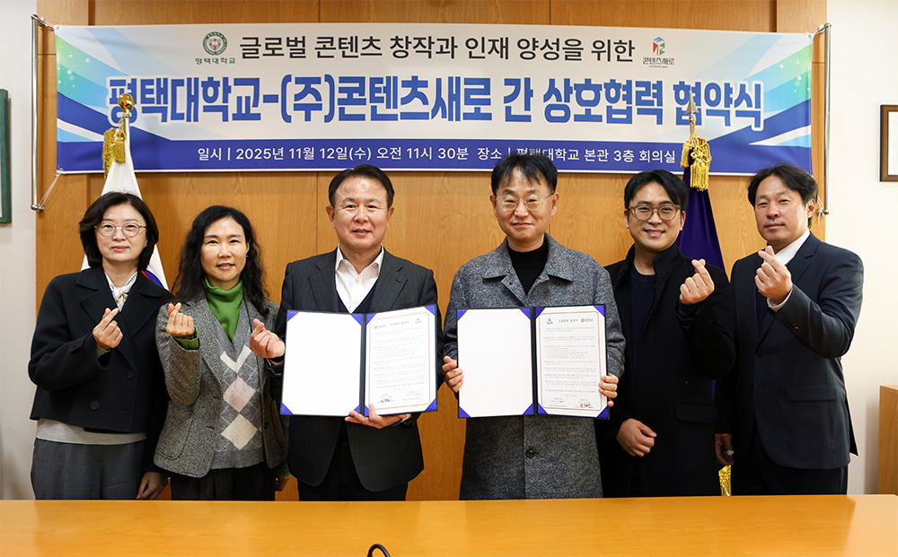 평택대학교(총장 이동현)와 (주)콘텐츠새로(대표이사 정태상)는 12일 평택대 본관 회의실에서 글로벌 창작과 인재 양성을 위한 업무협약(MOU)을 체결했다.