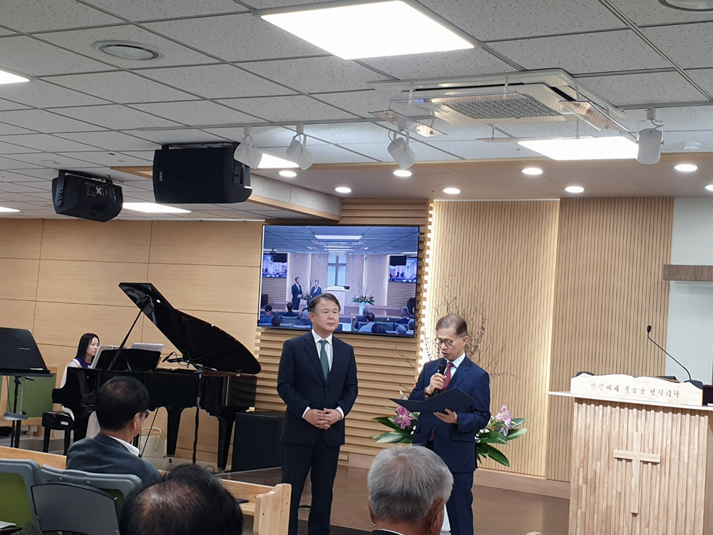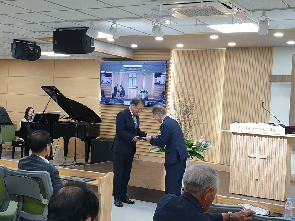 최근 예배실을 이전한 대학교회에서 원활한 이전에 감사를 표하며 대학 구성원을 대표하여 참석한 이동현 총장에게 감사장과 발전기금 1,000만원을 전달하였다.