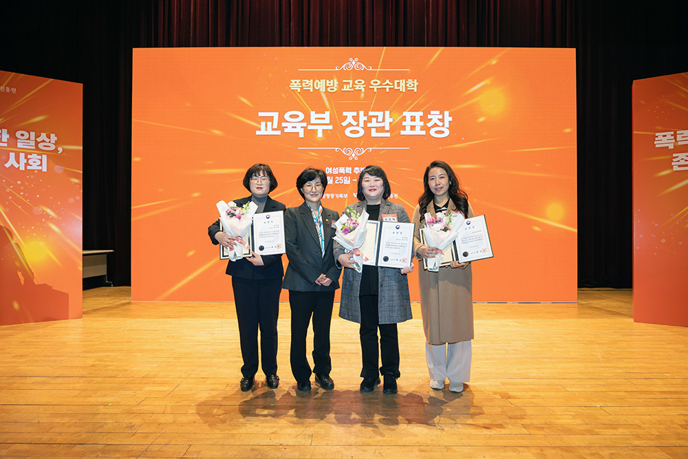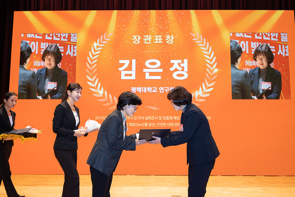 지난 11월 25일(화), 서울여성플라자에서 열린 ‘2025 성평등가족부 여성폭력추방주간 기념식’에서 평택대 인권센터에 재직 중인 김은정 연구원이 대학 내 폭력예방교육 활성화와 폭력예방 문화 확산에 기여한 공로를 인정받아 교육부 장관상을 받았다.